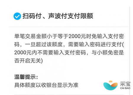 ? ? ? ?還有一種情況是,用戶在使用掃碼付、聲波付時,單筆金額小于等于2000元時免輸入支付密碼,一旦超過該額度,需要輸入密碼進行支付,這種情況只要2000以內都不需要輸入密碼,與是否開啟小額免密無關。
