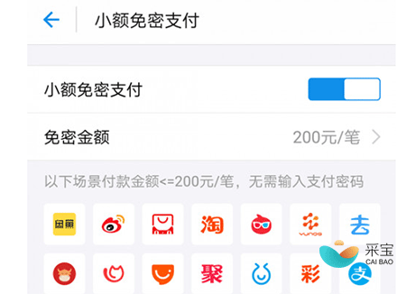 ? ? ? ?支付寶付款小額扣款的設置,也是提高收銀效率,同時滿足客戶手機支付的便利性,與系統是否存在漏洞并無大的關系。總體概括為兩種情況:1、用戶在支付寶的設置里開啟“小額免密支付”,并設置免密金額 ?2、在使用掃碼付、聲波支付時,單筆金額小于等于2000元時免輸入支付密碼