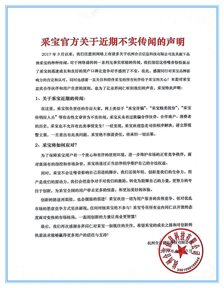 2017年3月以來,我們注意到網絡上有諸多關于杭州合言信息科技有限公司及其旗下品牌采寶的種種傳聞。對于網絡盛傳的一系列無事實依據的傳聞,我們深信這些噪音恰恰顯示了采寶的高速成長和良好的用戶口碑讓競爭對手感到了不安。在此,感謝同行對采寶品牌影響力的肯定和認可,同時也感謝一直關注和陪伴采寶的所有伙伴給予采寶的關心!本著對采寶忠實合作伙伴和用戶負責的原則,也為了讓業界同仁聽到我們的聲音,采寶特此聲明: