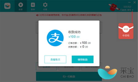 1 門店收銀員使用采寶桌面版(限V3.0及以上版本)推薦用戶使用支付寶、微信支付成功收款,可享受88元以內隨機現金紅包獎勵;